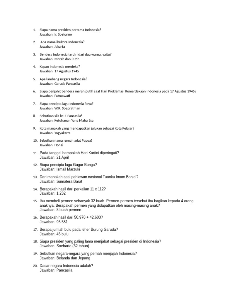 Berikut adalah contoh soal cerdas cermat yang mencakup berbagai mata pelajaran untuk masing-masing tingkatan kelas. Tingkat kesulitan soal disesuaikan dengan jenjang kelasnya.